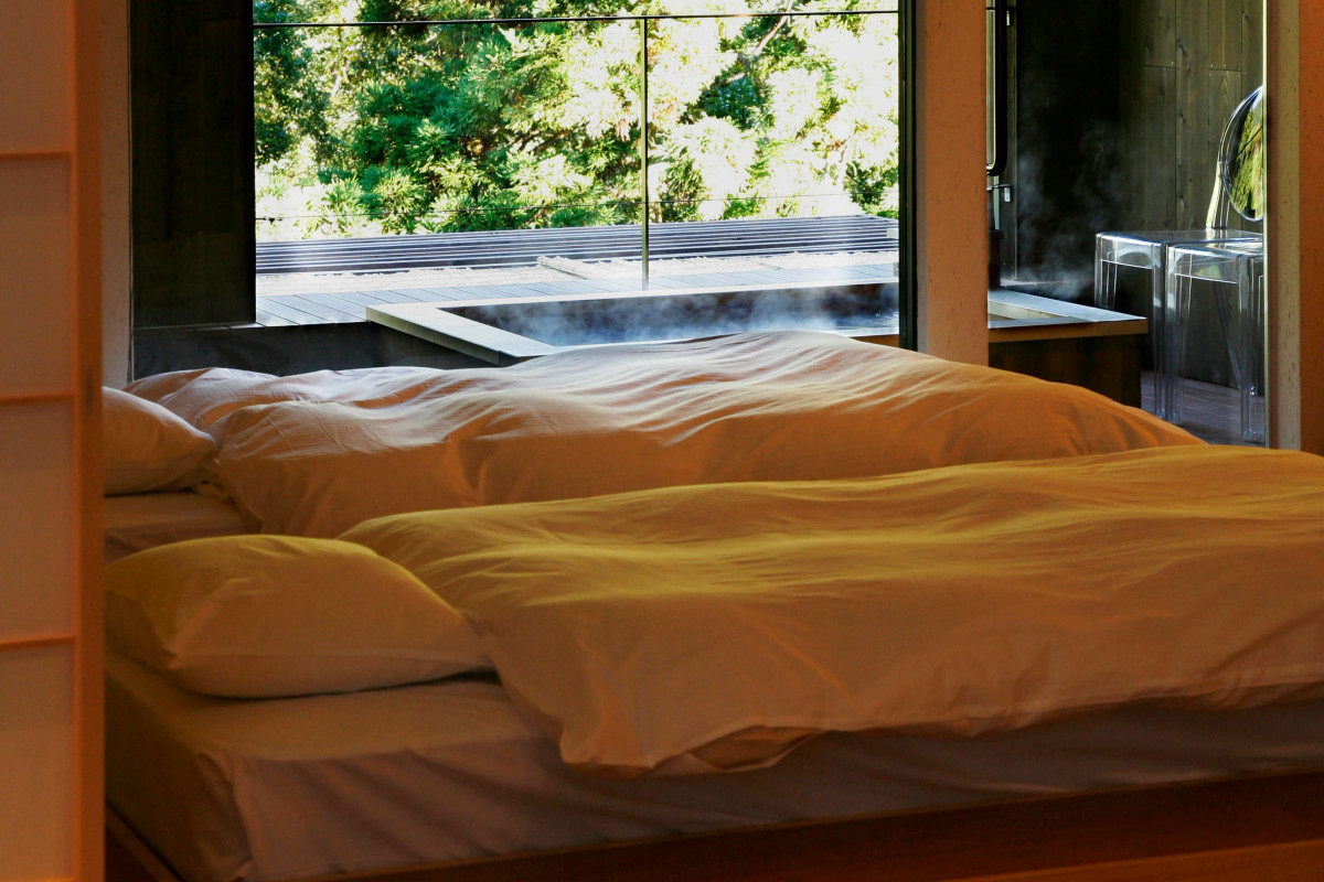 テラス露天+8畳にツインの寝室があつらわれた客室『海松』にてお寛ぎください。湯坂山の全景をとらえたパノラマの景色は、都会にいてはなかなか見られないものです。都心から2時間足らずという便利な立地にある温泉郷。テラスに配されたお客様専用の半露天風呂もあわせてご満喫くださいませ。