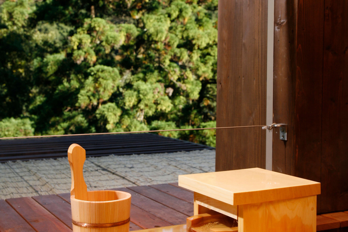 お部屋のテラスに露天風呂を用意させて頂いております。プライベート感あふれるバスタイムを過ごすには最適な環境をご用意しております。箱根の山々に囲まれた自然の息吹を裸で感じ、身も心もリフレッシュできるプライベート露天風呂。ヒノキほど硬くなく、杉ほど柔らかくない絶妙な肌触り、ヒノキ科の「ヒバ」の木でできた、源泉流れる湯舟の中で小鳥のさえずりをお楽しみいただけます。澄んだ空気の中で、春夏秋冬、昼と夜で異なる景観を見せる箱根の景色をご覧じながら、極上の湯浴みをどうぞ。