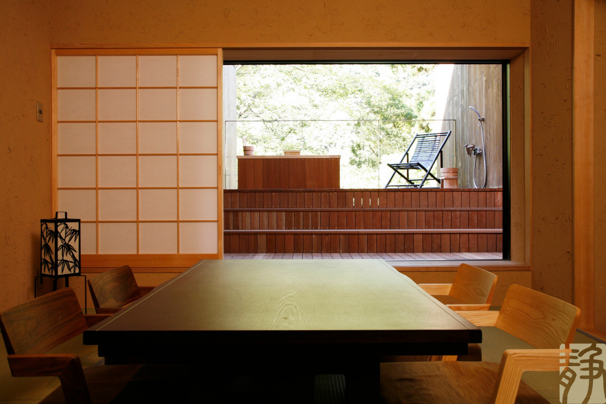 テラスに収まった半露天風呂に8畳の和室を携えたツインタイプのお部屋『蘇芳』をご用意しております。「和のテイストを中心に、いつまでも飽きのこない、普遍的なものを」。静観荘をリニューアルにあたってのコンセプトでございます。眺望と開放感に包まれて、非日常の世界へと誘われる…。その瞬間が、クセになります。