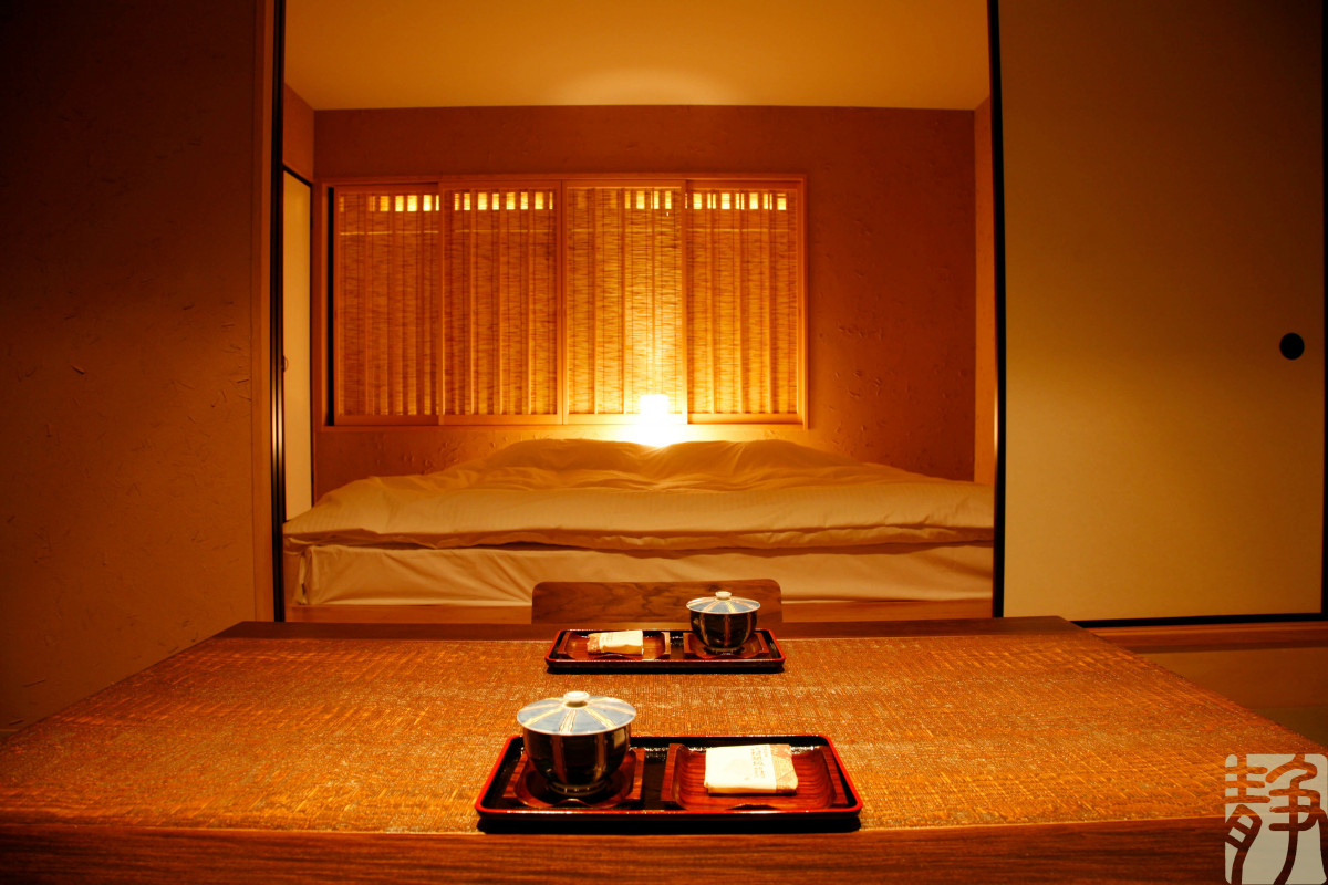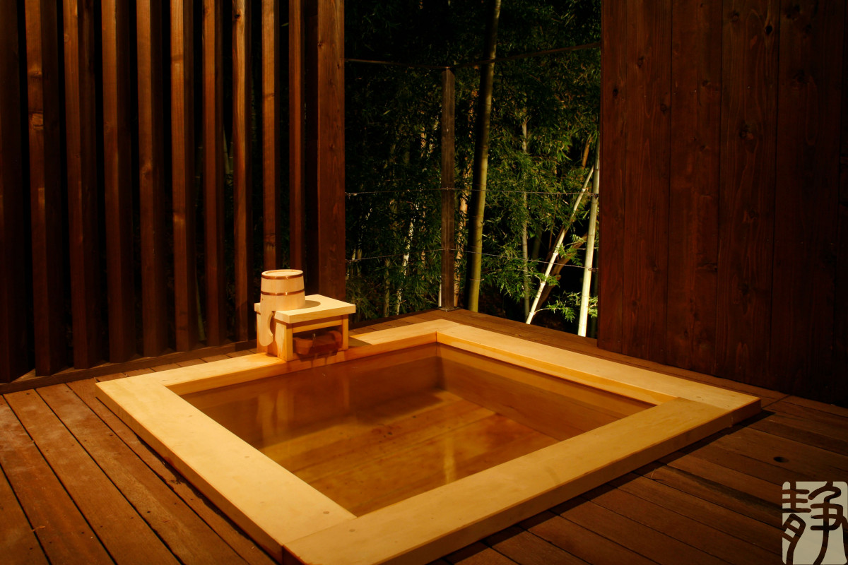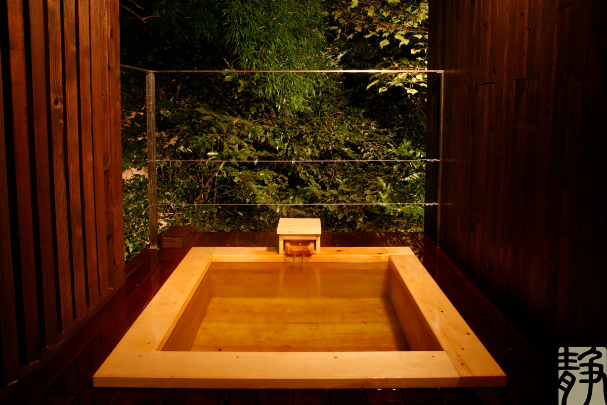 専用の露天風呂を館外地下2階にご用意いたしました。お部屋を一度出て静観荘の巧緻なデザインを眺めながら露天風呂へ向かう。部屋に籠ったままでは気づかない宿の楽しさを味わってください。